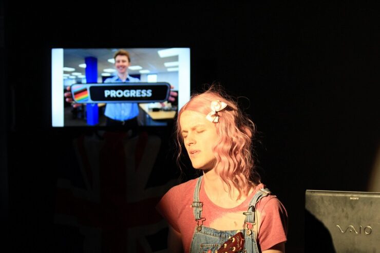 The Gay Train takes a thoroughly good go at diving headfirst into the way that Trans lives are presented in the media and the devastating consequences. In a world of P*ers M*rgan purposefully silencing the Trans Rights movement and framing it as healthy debate, even when it evidently is not, this kind of theatre is urgent and important. In fact, the aforementioned gutless false demagogue is the target in writer Andrew Lake’s crosshairs, as we see non-binary activist Lin face up against a TV host more interesting in clickbait than coherence.