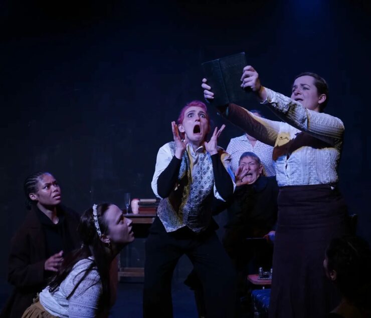 This section is performed entirely in period costume, with a full 19th Century Drawing Room set cast across the stage. This setting is delightful to see, as the actors emerge on stage they jump at the opportunity to lay waste to the efforts of men pre-World War One in creating a society that produces “Good People and Good Books”. The piece, at this point, lies behind an extremely thin veneer of a Fourth Wall, in which we can see quite evidently that the actors playing Poll and the rest are itching at the opportunity to flaunt and fancy the typical image of a Woman in this period, laying the groundwork for the anarchic madness that will soon ensue. You can tell from early on we are building up to some point of tension puncture, and it is delivered with such verve and style that ‘Plot Twist’ doesn’t even feel enough to cover it.
