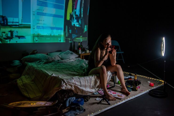 Eleanor, the character, livestreams to us the story of her early 30s, from a crazed squirrel that has been following her since childhood, to her relationship with her body and self-harm, substance abuse by the kilogram and her abusive relationship with an older married man named Tony. The technical elements of the show are pulled off brilliantly. To elucidate, there is a bedroom setup on stage with a huge screen behind it. Eleanor spends almost the entire time with phone in hand, slipping and sliding in and out of an Instagram Live, with the screen displaying her notifications as story moments, murderers cyber-stalking her halfway through, and images to complement the story popping up regularly to add to the comedy. This setup works best when the show is trying to make us laugh. It is clear also that significant consideration has been taken for the angles at which Eleanor films herself and how it can create a striking scene on stage. At one point fully swoddled in a blanket, we see Eleanor only through the screen and hear her muffled ramblings through the covers.