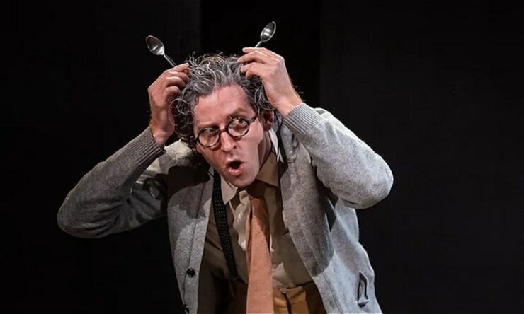 It is evident immediately that Tilley is a master clown – his outstretched limbs and wildly expressive facial movements drip instant life into the Old Man. Tilley takes everyday objects and breathes Pierrot-esque fancy into each of them with his movement – a tea bag becomes a football, a newspaper a deadly bee-slaying weapon, and two spoons the antennae of a household pest. He dips and dives around the homely but dreary set, evocative instantly of your Grandparents house to the point you feel you can almost smell it. As the shipping forecast drones on behind him, Old Man goes from bumbling around the stage to prancing across it with breakneck speed. No moment is wasted, every move driven by intent to charm and enthral.