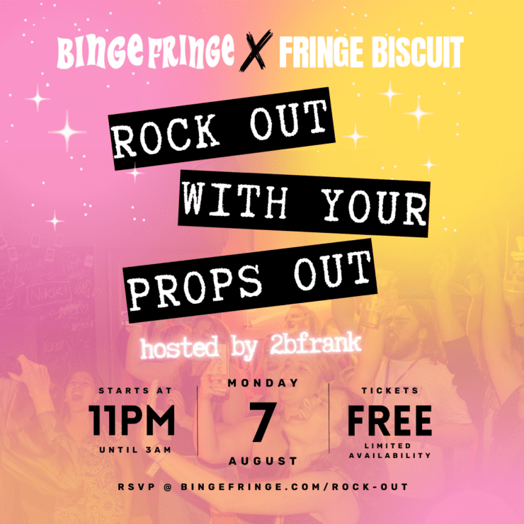 We’re back with another Fringe PARTY! After the roaring success of last year’s #FringeDisco, and taking about 12 months to recover, your favourite boozy indie publication is teaming up with our friends at Fringe Biscuit to throw the party of our dreams: ROCK OUT WITH YOUR PROPS OUT!