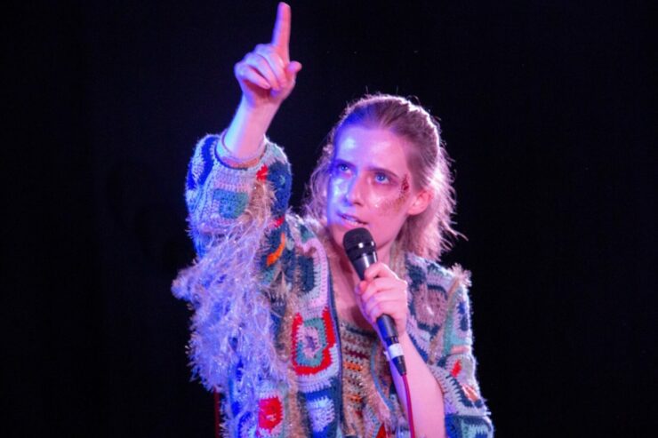 Eurovision, knitting, and self-expression unite to deliver an intriguing tale of trying to be your authentic self to a room of strangers, the artistic process, and confronting your Europop idols on a livestream. Unstitching minces a collateral set of dis-contiguous issues together in a fun and frenzied thematic pot luck. From frantic Spoken Word to Lip Syncs of your favourite ESC (that’s Eurovision Song Contest to the uneducated) winners, and pop psychology analysis of the way our minds and methods of communicating reflect the unhealthy relationships we have to news cycles and the internet – the format of this show is undoubtedly bizarre. Ruby Shrimpton’s quirky stage persona just about pulls you through the hour, as the content flickers between the lucid and the puffy, in her wild attempt to try and get what’s on the inside out into the open.