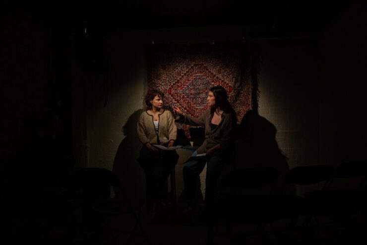 The performance felt as if it was made for that intimate basement space. It was stripped down to its bare bones making us, the audience, feel like voyeurs encroaching on a vulnerable moment in time shared by the two (three) actors on stage. I felt instantly drawn in and as soon as I found a pattern in the performance, the show pulled me out of my comfort zone. The show forced me to face my expectations of what theatre is and what theatre can do for us.