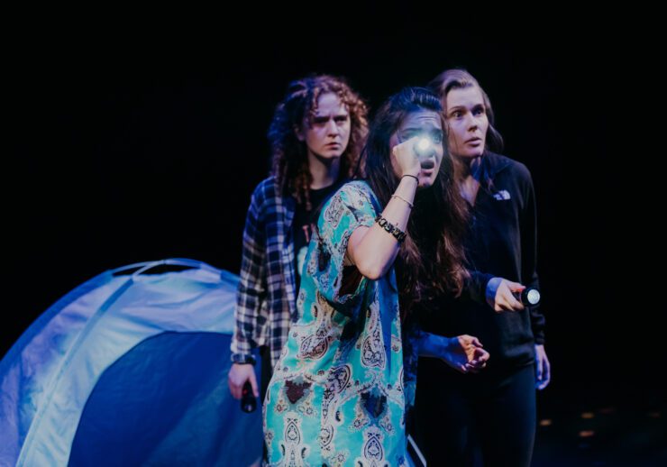 Suspense is woven in carefully through each scene as we explore the trios dynamics playing camping games and sussing each other out. It’s pace is slow but carefully and no way dulls our enjoyment. We’re introduced to the unsettling feeling early on when we’re met with a birds nest and you can feel the audience take a collective gulp. The actors each have points where it feels like we, the audience have been spotted, like they can hear us contributing this chilling feeling, they’re being watched and we’re not sure if its by us or something darker.