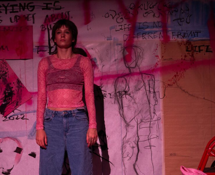 The set design in this show is breathtaking and responsible for some of the piece’s most effective moments. Created by Ioana Curelea and brought to life by the movement director Caterina Danzico, the set is built alongside the story. Starting as a blank paper backdrop, chalkboard, and pile of artist materials, the back wall is transformed into a means of archiving memories. And by the end the entire stage bursts with notes, mementos, splashes of angry colour and outlines of people lost along the way.