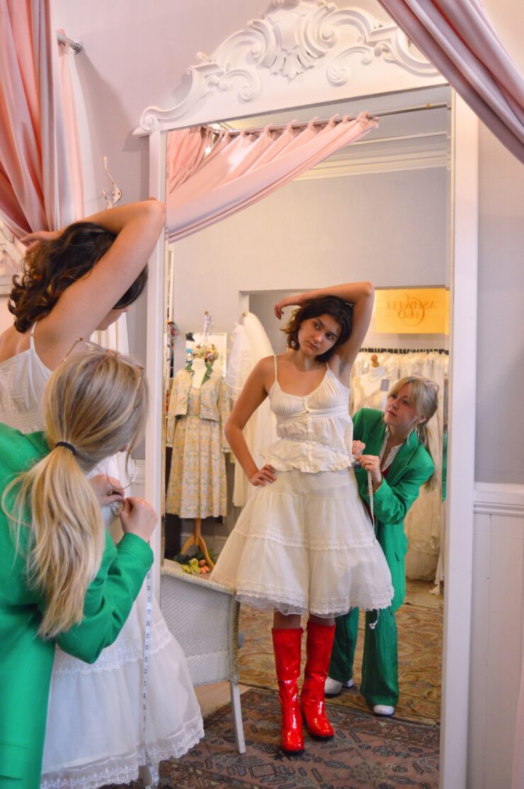 Elements of the production design leave us out in the cold a little – harsh bleak white-washes feel a little out of place for a bridal shop, even as they are supposed to highlight moments of awkwardness, it felt like an overly-stylistic choice for something which otherwise essentially runs as a straightforward narrative, with unity of time and place only disrupted by some sketch-style interludes. The set and prop pieces overload the small stage, and lead to a general feeling of clunky-ness that unfortunately pervades the drama.