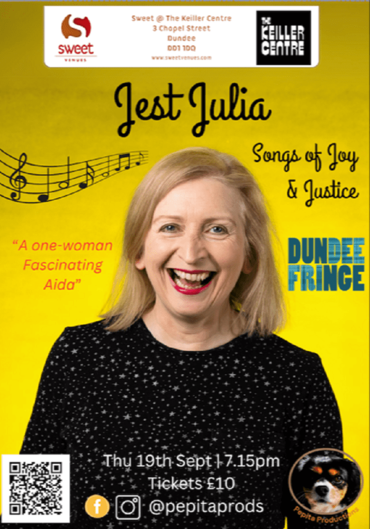 Catch Jest Julia – Songs of Joy and Justice at Sweet @ Keiller Centre from 19:15 on the 19th September. Tickets are available through the Dundee Fringe Box Office.