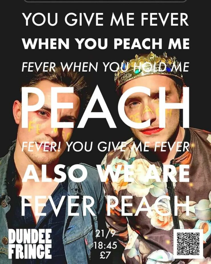 Catch FEVER PEACH: Greatest Pits tomorrow September 13th at 19:00. Also catch You Give Me Fever When You Peach Me, Fever When You Hold Me Peach. Fever! You Give Me Fever. Also We Are FEVER PEACH. on the 21st September at 18:45. Tickets are available through the Dundee Fringe Box Office.