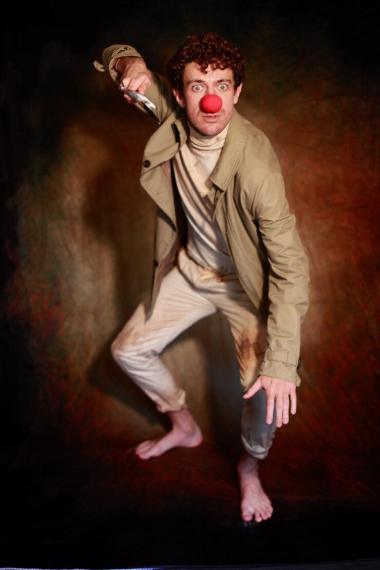 Locked in a small room with a couple of clown noses and a chest containing a script for a one-man Hamlet—adorned with a sticker of the Welsh dragon—Blythe dons the clown nose and performs the play’s most iconic scenes. Meanwhile, a mysterious voice (a nurse? His mother?) interrupts him in Welsh. This voice seems to unsettle him, pulling him out of character and back into the role of the performer: an almost mute clown seeking refuge in Shakespeare.