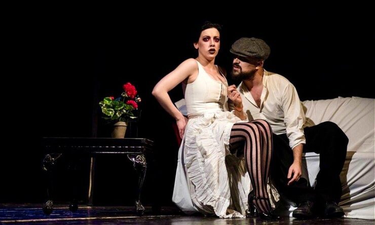 The first covers the story of the butcher, a known killer who seeks to hide in the brothel from the authorities. Starring Giula Rachele Mazza and Lorenzo Andrea Paolo Balducci who command the stage with expert stage presence and marvellous comedic and dramatic performances. Mazza plays a new employee at the brothel, excited to work but also nervous about the duties she is expected to perform, she plays the excitement and enthusiasm well against her clear hesitancy to commit fully to her new job role. Balducci is an incredibly intimidating presence in this story, making the audience shift uncomfortably in their seats as he threatens the girls of the brothel.
