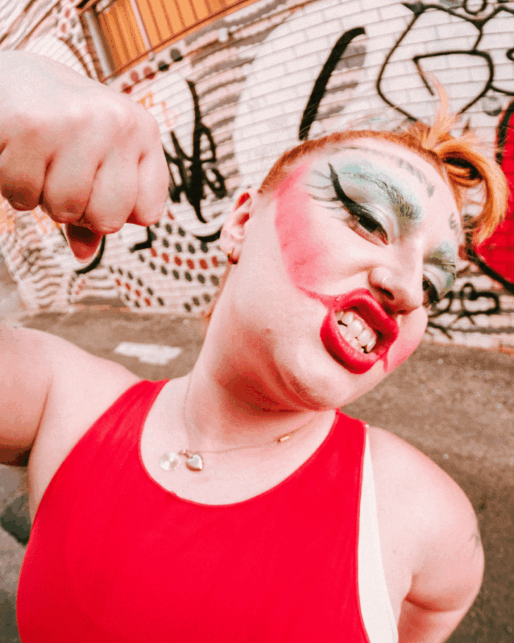 I’ve been assumed to be a drag king constantly out of drag when people find out what the performance is. I think as a cis woman and a lesbian that’s just what people expect from you. But, Big Red isn’t that, and not a queen either. Big Red is a sort of drag persona. The genderless, clown, dragged-up version of myself. They are obviously not this beautifully sculpted queen with a perfectly painted mug. My character is heavily inspired by ugly, gaudy, character-drag artists like Divine, Leigh Bowery, and Lily Savage.