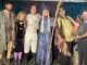 Three drunken performers surrounding distressed cloakroom attendant lead performer