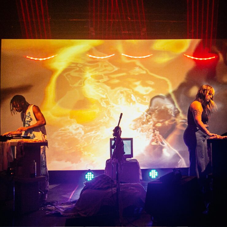 A projected moon spins over forestry before morphing throughout the performance into distorted human forms. Live feed captures intimate, voyeuristic moments, like a wax-covered doll being stroked and the entrapment of bodies in organza. Laptops and CDJs on opposite sides of the stage call out to each other further entrenching the reciprocal relationship of all elements. Centre upstage holds patterned fabric, a sound bath, candles, crystals, and a woven basket, grounding the ceremony in memory and presence.