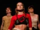 Throughout the show, Adra sheds hair hats unfamiliar to her texture, revealing golden and black braids curling past her shoulders. The red thread running throughout the design, from lips, glasses, fans, nails, mic muffs, sneaker shoes, to guitar straps was a bold and unifying visual signature.
