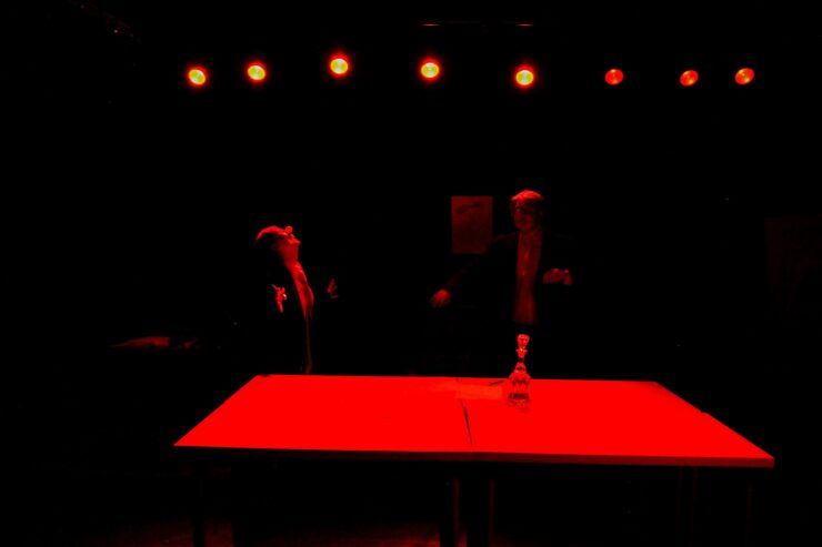 Utilising Brechtian techniques and layers upon layers of meta-theatre, the company have created something truly unique in terms of modern day Fringe offerings. The first act sees two red-nosed and red-tied clowns hashing out a masterplan to reinvigorate their electoral chances following a nosedive in the polls. One, Sir Kevin Prime Minister (as thinly veiled a tribute as it sounds) clings onto the delusion that he’ll be able to woo the rising far-right by leaning into their rhetoric. Meanwhile, his junior, aptly named Junior, plots to turn the tide and create meaningful change. I’m sure you can imagine which one begins to get their way.