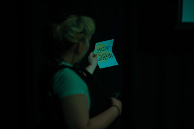 Sluts with Consoles predominantly a piece that puts female and feminine rage front-and-centre – a later and pungent section of the piece that sees Player 1 take advantage of the objectification that both players have experienced rings with nuance and urgency in a world where gamers develop (often unhealthy) parasocial relationships with streamers alongside the pipelines-galore of male toxicity that exist online. As Players 1 & 2 are exposed to the harmful effects they ask the question “how can we love a hobby and community that doesn’t seem to love us back?”