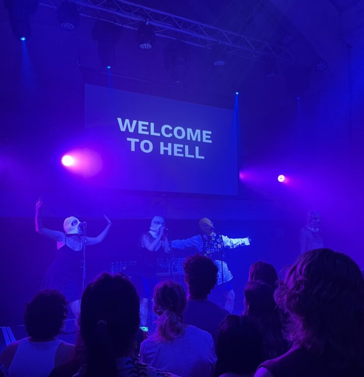 Politically loaded messages flash up on the screen in aggressive black font – ‘Welcome To Hell’ is burned onto the screen at one point. Another pivotal moment; the names and faces of political prisoners are splayed on the screen in rapid succession. The riotous tone then shifts into one of tragedy as the group highlights the story of Russian journalist Irina Slavina, who in 2020 set herself on fire outside the Ministry of Internal Affairs as an act of deliberate political protest. The inclusion of CCTV footage of the act, a moment which was harrowingly difficult to watch, elicited audible reactions from the crowd; a gutter-punch moment where the real-world stakes of dissent and oppression are visceral. Such a performance moves beyond spectacle; it’s a rallying cry to remember those who have given their lives to speak truth to power.