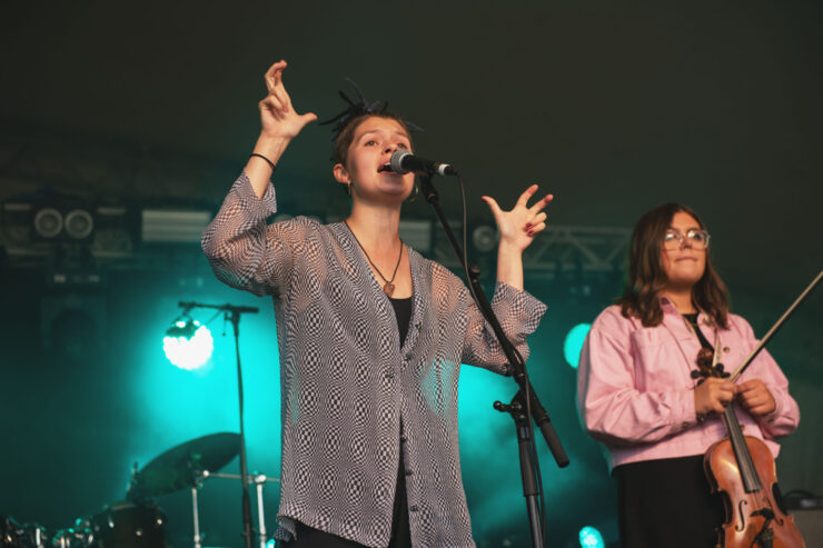Waddell’s facial expressions are ones of open, engaged curiosity throughout as she invites us to engage in a surrealist world of silly fun and imaginative creativity. One moment she’s dancing in a chicken hat; the next the audience are being invited to pet a giant soft toy fly. There are plenty of props to keep us engaged, and occasionally ducking in our seats – there is a row of mini doughnuts tied to a string and swung throughout the audience at one point in the show, and plastic balls thrown in our direction during another – but it is Evie Waddell’s skills as a dancer and singer which keep our full attention, no additional gags needed. Audience participation is also invited at several points during the show, with Waddell and Cheskin’s bilingual version of Women of The World proving truly moving as everyone begins joining in the looping refrain in both BSL and English, the room full of flowing movement and communal song.