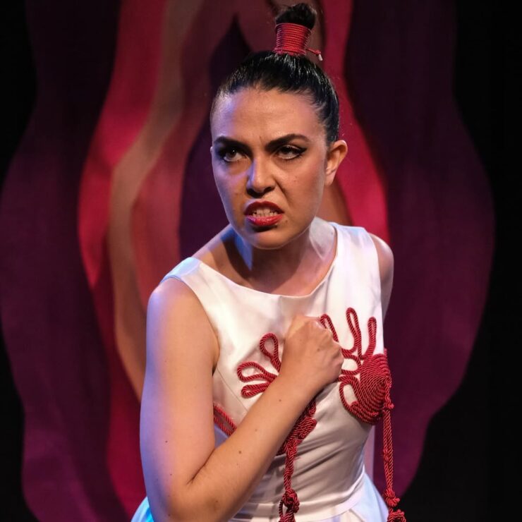 Walking into the space, stage right sits a wicker stool spilling out a maroon woolly tongue-shaped rug, a visceral symbol of the body as an incubator. Renato Baldin’s costume and set design merge seamlessly, a kaleidoscope of pinkish vulvic layers on the back wall upstage, evoking both creation and destruction. Pussy brings life and pussy can take it away.